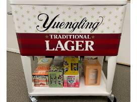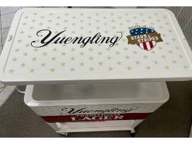 Yuengling Raise the Bar cooler on wheels. This sleek cooler has a ~37QT capacity with a built-in bottle opener, bottle cap catcher, lower shelf, and a lid that's able to elevate 8", this cooler transforms into a full bar! The Raise the Bar Cooler is the ultimate display item.