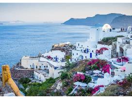 in contrast against lush rolling green hills and white stone houses, Santorini is a tourists heavenly dream.
