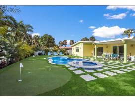 The highlight of the tropically landscaped backyard is the sparkling heated pool and spa surrounded by pool loungers and Adirondack chairs. The backyard is sure to please with a 3-hole putting green, corn hole, and outdoor shower. For outdoor dining at the patio table for six, a gas grill is provided.