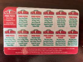 Coupon also comes with various BOGO offers for pizzas. Each card is over $1500 in value. BOGO Examples: Buy one pizza get free pizza, Buy one pizza get free breadsticks. etc.
