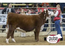 SR Dominate 308F is a National Champion bull that is going to make a huge impact with his progeny. Dominate is a massive made bull with the range bull look that was competitive in the Show Ring. He is free moving, clean fronted, long sided, full rib, wide back and exhibits ideal muscle pattern in his quarter and down his back. Shows eye appeal with his head up on his smooth shoulder, correct feet and leg structure, good markings, pigmented eyes and has the ability to show presence with his look.