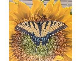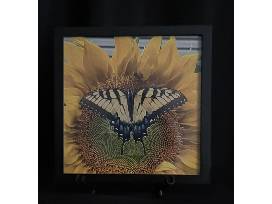 In this luminous capture, a butterfly graces the golden petals of a sunflower with quiet elegance. Its wings, etched in bold black and sunlit yellow, mirror the flower's radiant energy, creating a moment of perfect symmetry between flora and fauna. Framed in black, the 12" x 12" image becomes a celebration of nature's design-simple, striking, and serenely alive.