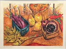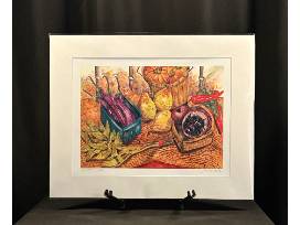 The artist captures the vibrant essence of a bustling market day in St. Augustine, Florida. The scene is alive with an array of fresh produce displayed on a rustic wooden table, each item painted with meticulous care to highlight its natural beauty and texture. Amidst this bountiful display, a curious little visitor peeks from behind the table, adding a whimsical touch to the composition. This delightful detail brings warmth and charm to the piece, evoking memories of childhood adventures and discoveries in such vibrant community spaces. The matted 16" x 20" piece is signed by the artist.