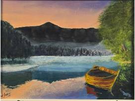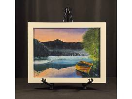 Tranquility is painted with masterful strokes, capturing a serene moment where nature whispers its calm in this 9" x 12" framed piece. The lake, a mirror to the sky, reflects the gentle transition from the warm embrace of sunset to the cool twilight hues. A solitary wooden boat rests quietly by the shore, surrounded by lush greenery that frames the scene with vibrant foliage. The harmonious blend of colors evoke a profound sense of peace, inviting viewers to lose themselves in the idyllic beauty of this serene landscape.