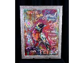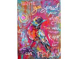 Inspired by the guidance of Maria's father, who shared a special connection with robins, this artwork captures the essence of the bird in a burst of dynamic brushstrokes and vivid hues. The robin, depicted in striking shades of orange, red, and blue, stands out against an abstract background filled with swirling patterns. Surrounding the bird is an uplifting message adding to the visual experience.