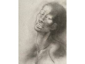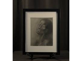 A captivating charcoal portrait that exudes both strength and vulnerability. The matted and framed artwork features a person with an expressive face, slightly tilted upwards, capturing a moment of introspection or contemplation. The use of light and shadow is masterful, highlighting the contours of the face and neck while leaving parts in soft obscurity. The texture of the charcoal adds depth and emotion to the piece, making it feel almost lifelike. The background is kept minimalistic, ensuring that all attention remains on the subject's powerful expression.