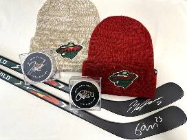 Bid now on this rookie pack, featuring items signed by two of the best rookies in the NHL this year! This pack includes a Marco Rossi goal puck scored at 3:10 of Period 2 against the New Jersey Devils on November 2, 2023, a Faber goal puck scored at 8:57 of Period 3 against the Montreal Canadiens on December 21, 2023, two beanies, and two signed mini sticks. Certificates of Authenticity available upon request.