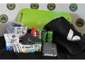 Training Journal, gym bag, assortment of protein samples and energy drinks.