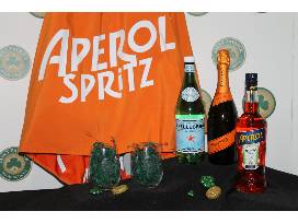 Aperol logo'd Patio Umbrella and two SPHS wine glasses