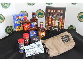 Assortment of Hot Sauces, Famous Dave's rubs, sauces. Corn Bread and apron.