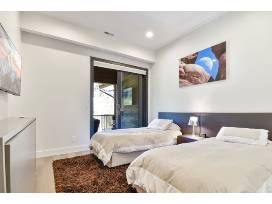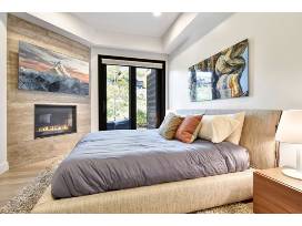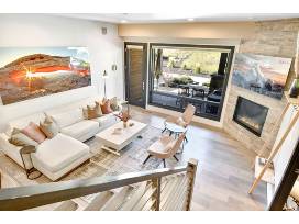 Guests will love the upper-level deck's private hot tub and fire table, as well as access to the private community's Junior Olympic-sized swimming pool and a gym with a sauna. A bright and airy open floor plan welcomes guests into this 2-story unit. The comfortable and stylish living area boasts cozy furnishings and a stunning gas fireplace with a wall-mounted TV overhead for entertainment. The modern kitchen has spacious countertops, high-end appliances, and a kitchen island that doubles as a 4-stool breakfast bar.