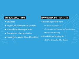 HawkGrips Topicals: A full line of premium products, including an Emollient Jar, Single-Use Emollient, Professional Massage Cream, Therapeutic Massage Lotion, and HawkHydro Water-Based Emollient.