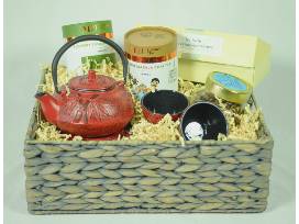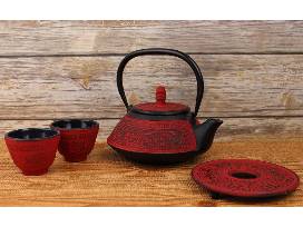 Vintage 5-piece Japanese Cast Iron Tetsubin Tea Set and assorted selection of teas. (Tea Forte Assorted Classic Tea Sampler, M21 Luxury Tea Jasmine Green, M21 Cochin Masala Chai, and Orange Spiced Herbal loose tea)