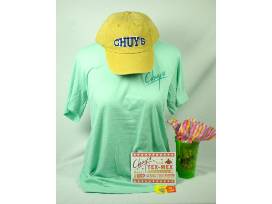 Enjoy a gift card for Dinner for Two which includes appetizers, entrees and dessert. You'll also get a t-shirt (adult size medium, but can be exchanged at the restaurant for different sizes), a Chuy's tumbler, adult baseball cap, VIP Free Queso Card, VIP 10% off Every Visit Card, and Business Lunch Member Card.