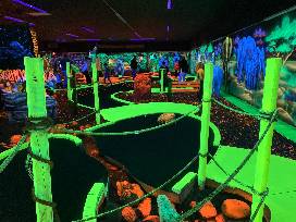 The entire 18-hole miniature golf course is indoors and takes you on an adventure through 4 themed areas complete with theatrical scenery, lights, and sound. You can also choose to get a bag of our gold tokens to bring the story to life through animatronics, video, and special effects* as you make your way through the course. (*Please be aware that our adventure uses strobe lights, sound effects, and fog effects. Speak with a crew member if you have any questions of concerns about our course.)