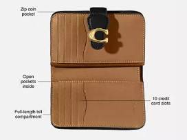 Coach Black Tabby medium wallet is crafted of smooth leather, this bi-fold Tabby medium wallet is a modern take on an archival 1970s Coach design. Featuring a convenient exterior zip pocket for coins, receipts, earbuds and other small essentials, it unsnaps to reveal ten card slots, slip pockets and a full-length bill compartment.