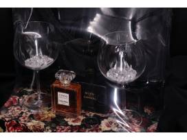 Chanel basket featuring a Ming Wang Tote in midnight black, two wine glasses, and 2 bottles of Chanel parfum.