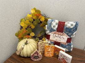 Fall-themed basket with door wreath, decorative pumpkin, assorted wood signs and fall throw blanket.