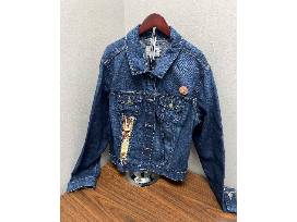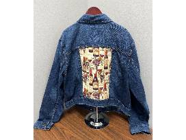 Denim Wine Jacket hand embellished with quilting, thread-painting, and a wine pin. The jacket is size XXL.