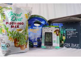 In this package you will get: one pack of led string lights, 100 ft garden hose, one bag of potting soil, one temperature station and two kneeling pads.