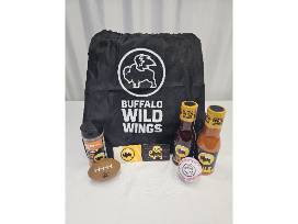 The swag bag includes: 1 bottle of Fire Roasted Pepper Chipotle BBQ Seasoning, 1 Bottle of Asian Zing sauce, 1 Bottle of Mild sauce, two stress balls, and a Buffalo Wild Wings tote bag.