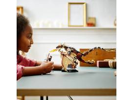 This Lego set is a buildable dragon with movable wings. It's authentic features include a spiked tail, black scales, fiery breath and jointed wings that flap when a handle is turned. It's jointed wings move up and down, and you can turn the handle at the rear to control the dragon's wings. The eye-catching display piece stand includes a Harry Potter minifigure on a broomstick.