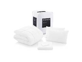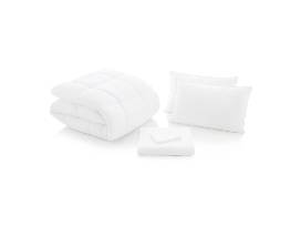This bed in a bag includes a queen size comforter, 2 pillows, and a sheet set white in color..