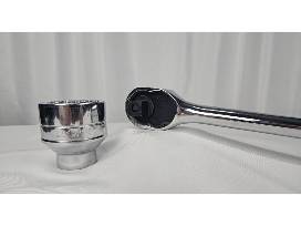 This socket wrench (with socket) has a steel handle, round shank and comfortable handgrip. The male drive tang has a spring loaded steel ball to hold sockets and attachments firmly in place.