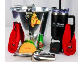 Bid on this galvanized bucket filled with a tumbler, 2 drink cozies with built in bottle cap removers, plus a hanging bottle opener, a bag clip for chips, a scoop, a credit card holder for your cell phone, a taco chew toy, and a $125.00 gift card for dinner.