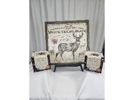 The picture is a Ryan Kirby wall art decoration. Depicting a white tail buck with a description of their antlers as they age and what their range is. Framed in wood and made of metal it measures 21" x 21".