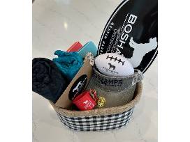 The Boshamps Gift Basket includes: a $100 Gift Card; 2 T-shirts; 1 Visor; 1 Shot Glass; 2 Koozies; 1 Small Foam Football; 1 Custom License Plate.