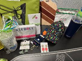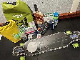 Ghost Longboard (longer skateboard with lights) Value-$400; Pickleball Basket (May include Pickleball paddle, Pickleball socks, misc pickleball themed items) Value-$300; Icemule Basket (Icemule Cooler & Icemule cups) Value-$300.
