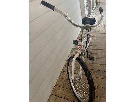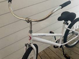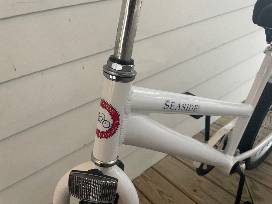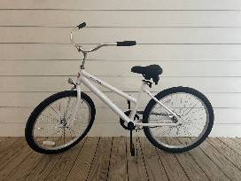 Enjoy a smooth and comfortable ride on a white Seaside Transit Authority? 24" bike, custom designed with the classic beach cruiser style. This bike has wide tires, a relaxed upright seating position and timeless classic styling. To ride this bike, you need to be between 4' 7" and 5' 3" tall.