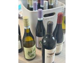 Two cases of wine donated by PSP Wine Imports, displayed in gray Welli Bins.