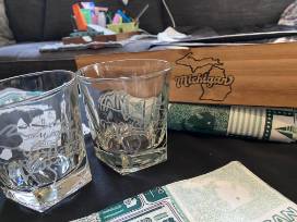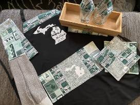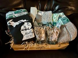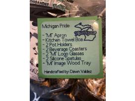 Handmade by LPS employee Dawn Valdez, this Kitchen Basket includes a (state of) Michigan apron, a kitchen towel boa, two (2) potholders, two (2) beverage coasters, two (2) "MI" logo glasses, and 2 silicone spatulas all in green and white/state of Michigan inspired and beautifully packaged in an "MI" image wood tray!