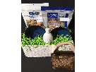 Dog gift basket contains complementary, dental cleaning, bowl, dog shampoo, plush toy and 2 dog treats.