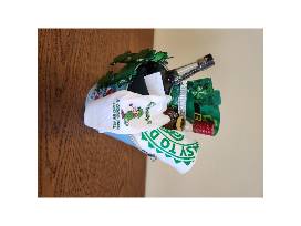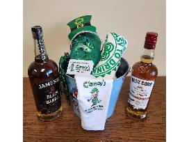 Basket includes: 1 bottle of Jameson Black Barrel Irish Whiskey, 1 bottle of West Cork Irish Whiskey, 2 - logo Clancy's T-Shirts, 2 - White logo buffs, 1 - Clancy's gift card and fun glasses
