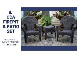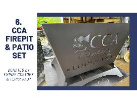 Enjoy this CCA CENLA edition firepit featuring grill grate and CCA CENLA logo along with an Adams Brown all-weather wicker patio set. Perfect for weekends at the camp or just nights in the yard. Donated by Empire Kustoms and Terry Raby.