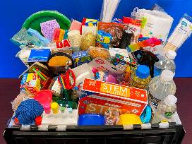 1 Box of STEM Challenges (30 cards) and lots of the Supplies You'll Need to Accept the Challenges, including Crepe Paper, Glue, Paper Plates, Play-doh, Magnets, Pencils, Toothpicks, Craft Sticks, Yarn, Construction Paper, Foil, Plastic Wrap, Wax Paper, Paper Towels, Paint Brushes, Magnifying Glass, Flashlight, Pebbles, Soil, & Sand, Glass Droppers, Dish Soap, & much, much more.