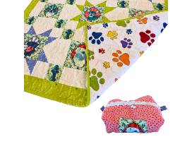 Snuggle up in style with this charming lap quilt, measuring 34" x 54", and matching pouch made by HOV volunteers Kim Doyle and Josie Kramer. The quilt features an adorable fabric with portraits of dogs and fire hydrants, surrounded by colorful pieced stars that add a playful touch. The vibrant paw print fabric on the quilt back complements the design perfectly. As a special bonus, this cozy quilt comes with a matching handmade zipper pouch, making it a versatile set for both comfort and convenience. Whether you're curling up with a good book or enjoying a picnic in the park, this delightful quilt and pouch combo is sure to become your go-to companion.