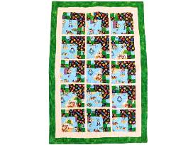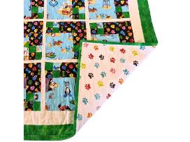 Discover the perfect blend of comfort and charm with this quilted wall hanging or baby quilt measuring 36" x 24", lovingly crafted by HOV volunteer Kim Doyle. Adorable dog-themed fabric featuring playful pups at the beach adorns the quilt piecing, while the cuddle paw print flannel backing adds an extra layer of softness and warmth. Bordered in vibrant green, this quilt exudes a bright and fun aesthetic that is sure to delight. Whether used as a decorative wall hanging or a snuggly companion for a little one, this one-of-a-kind creation will be a cherished addition to any home.