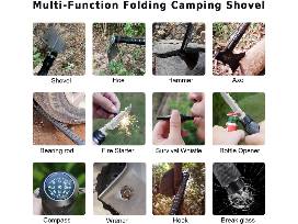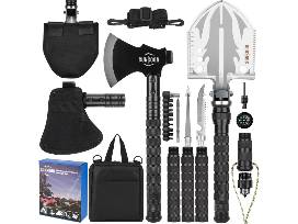 This tool can do it all. It's a shovel, hammer, axe and bearing rod. It has a whistle, compass, Fire Starter, and more. Handle can be made into four different lengths. Comes in great storage pouch to store in car or throw in with your camping gear.
