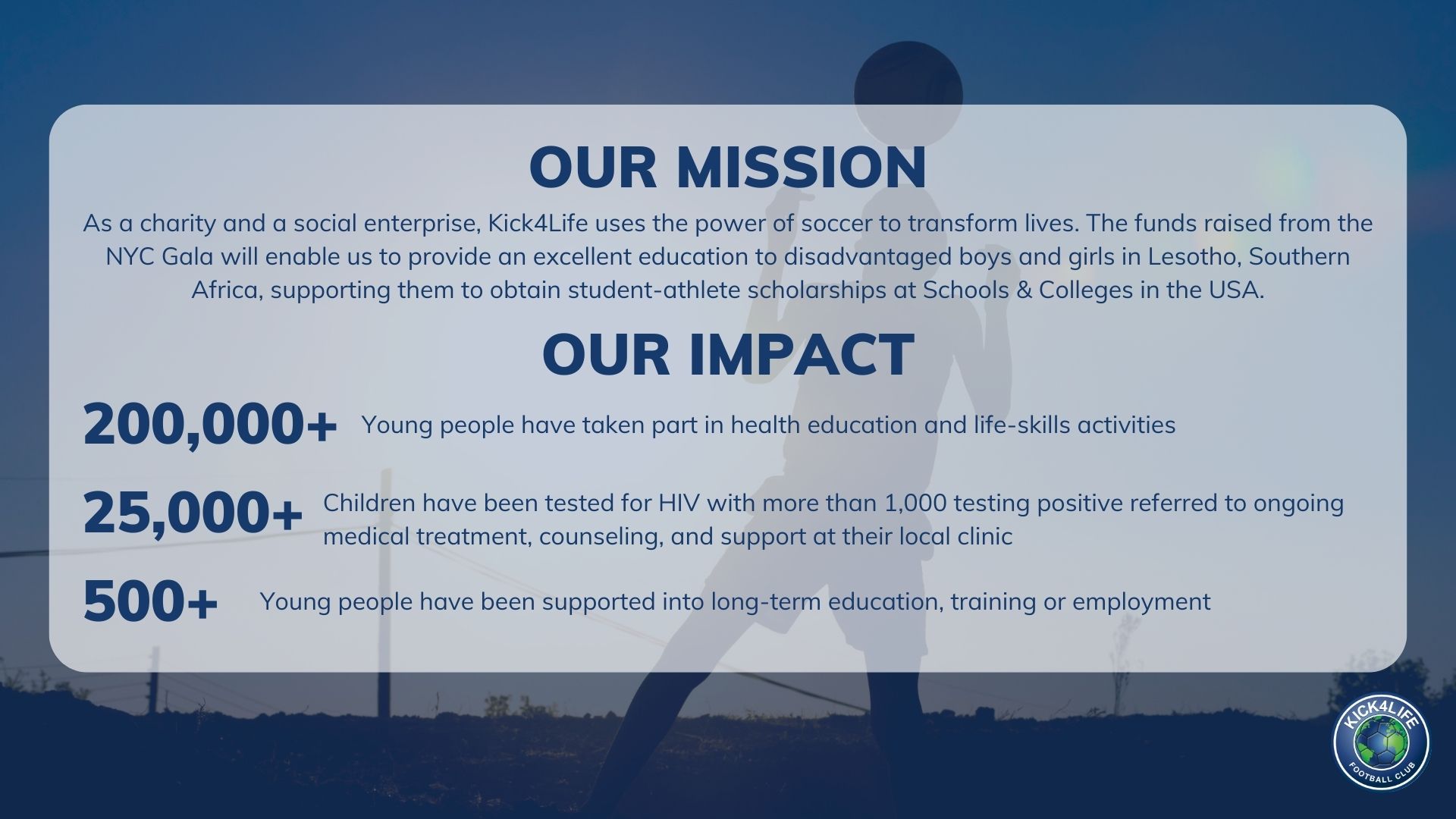 The K4L Gala will bring together our community of participants, supporters and donors, as well as influencers from sports, fashion, business, and entertainment for an evening dedicated to raising crucial funds for our life-changing work through soccer in Lesotho, Southern Africa.