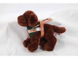 Oh this Chocolate Lab plush pup is adorable! Sitting in repose, this soft plush pup has dark eyes and a dark nose. With a handmade harness, this pup in training even has a green bandana with The Seeing Eye's logo written in white. This dog measures about 8 inches from nose to tail, and is approximately 6 inches tall. These harnesses are toys and not intended for use on live animals.