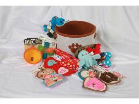 Sturdy and attractive, this felt bucket has a heart-shaped paw print on front and handles on the side. It is chock full of pet playthings sure to please your pup.