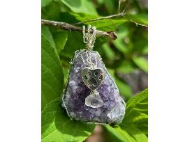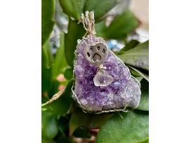 This exquisite natural Raw Amethyst Druze pendant, measuring 2 inches in length (including the silver hook), is a unique piece from the exclusive "You Left a Paw Print in My Heart" collection. The pendant features a stunning purple and lilac amethyst cluster stone, artfully wrapped and adorned with a 10mm antique silver heart charm showcasing a delicate dog paw print. Suspended from the charm is a half-inch frosted quartz clear teardrop stone, adding a touch of elegance. Known for its natural stress-relieving and healing properties, the amethyst's true beauty is beyond what pictures can capture. This pendant is more than just a piece of jewelry; it's a cherished reminder of the paw prints left on your heart.