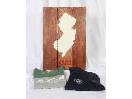 - New Jersey Wood plaque with the word "Home" in red sparkly letters below the white graphic of the state