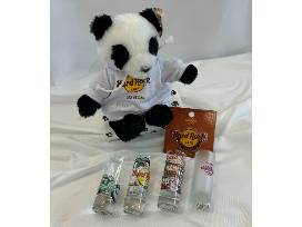 Collectable Hard Rock Café Swag! Package includes a Hard Rock Las Vegas Hoodie on an adorable 8" plush panda bear, Hard Rock San Francisco magnet, Hard Rock Mardi Gras 2009 shot glass, Hard Rock Las Vegas shot glass, 2009 Hard Rock St. Patrick's Day shot glass, and a 2002 Hard Rock Americana shot glass.