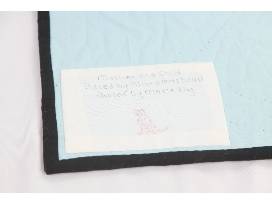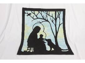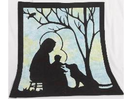 This exquisite piece of handcrafted art tells a heartwarming and spiritual story of love between a mother, child and dog. The quilt shows a silhouetted image of a mother sitting on a stool under a tree with a child on her lap. The child is reaching out to touch a sitting dog's nose and a small bird sits in the tree overlooking the scene. The background has yellow and blue hues, and the quilt is edged in black. Generously sized, approximately 30x24 inches.