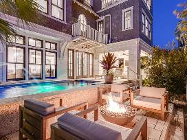 The home's first level features a beautifully crafted kitchen, living room, and an alfresco dining table with direct access to the veranda. The outdoor area features a pool complete with lights and fountains, an outdoor fireplace, and a fire bowl. There is also a king bedroom on this floor with a private shower.